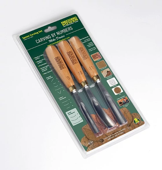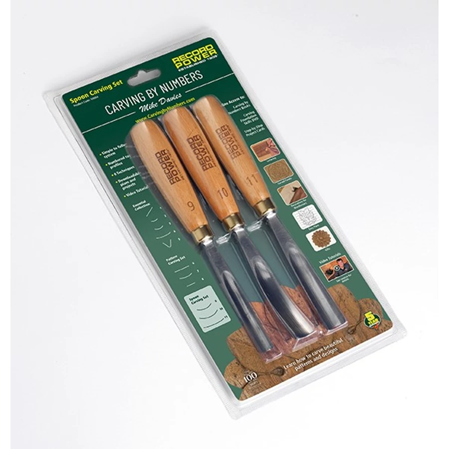 A 3 darabos króm-vanádium prémium fafaragó vésőkészlet a teljes Woodcarving by Numbers oktatóanyaggal.