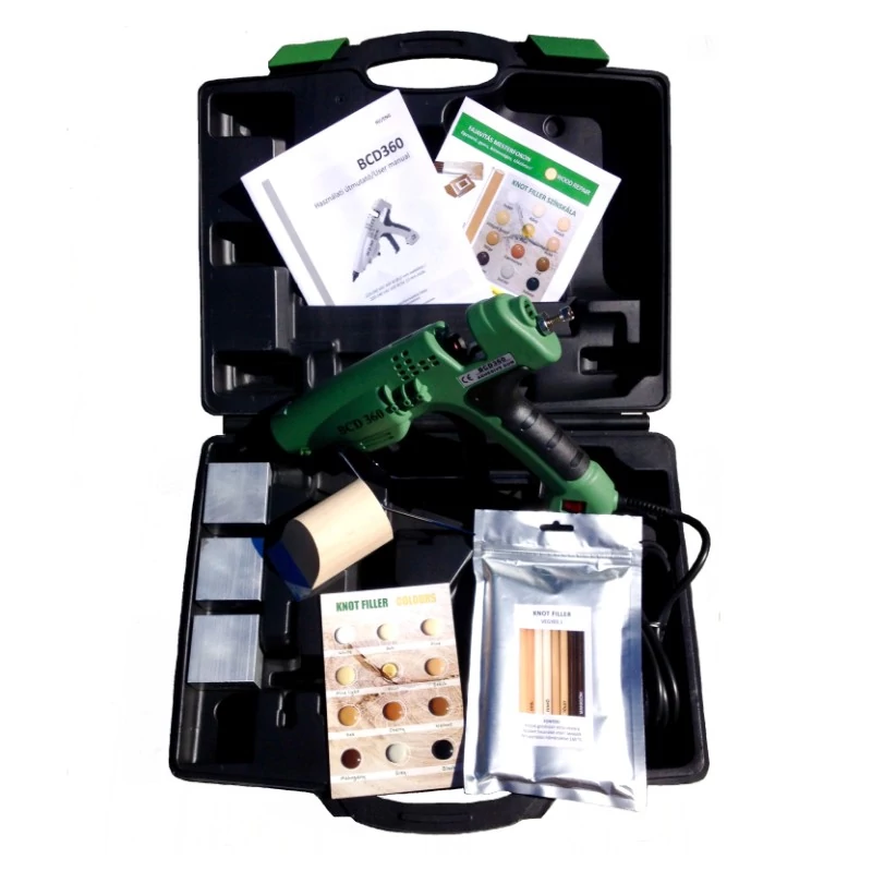 Wood Repair Knot Filler GORDIUS - BCD360 300W vezetékes, változtatható hőmérsékletű ipari pisztoly 1 db 3 mm –es pótfúvókával, 3 db hűtőkocka, kézigyalu, 1 csomag kompakt kiszerelésű, vegyes színekből álló javítóanyag, színminta kártya, mindezek egy praktikus műanyag kofferben (hamarosan karton dobozra vált a gyártó). Ipari pisztoly és a legfontosabb eszközök egy készletben. Karton dobozban szállítjuk.